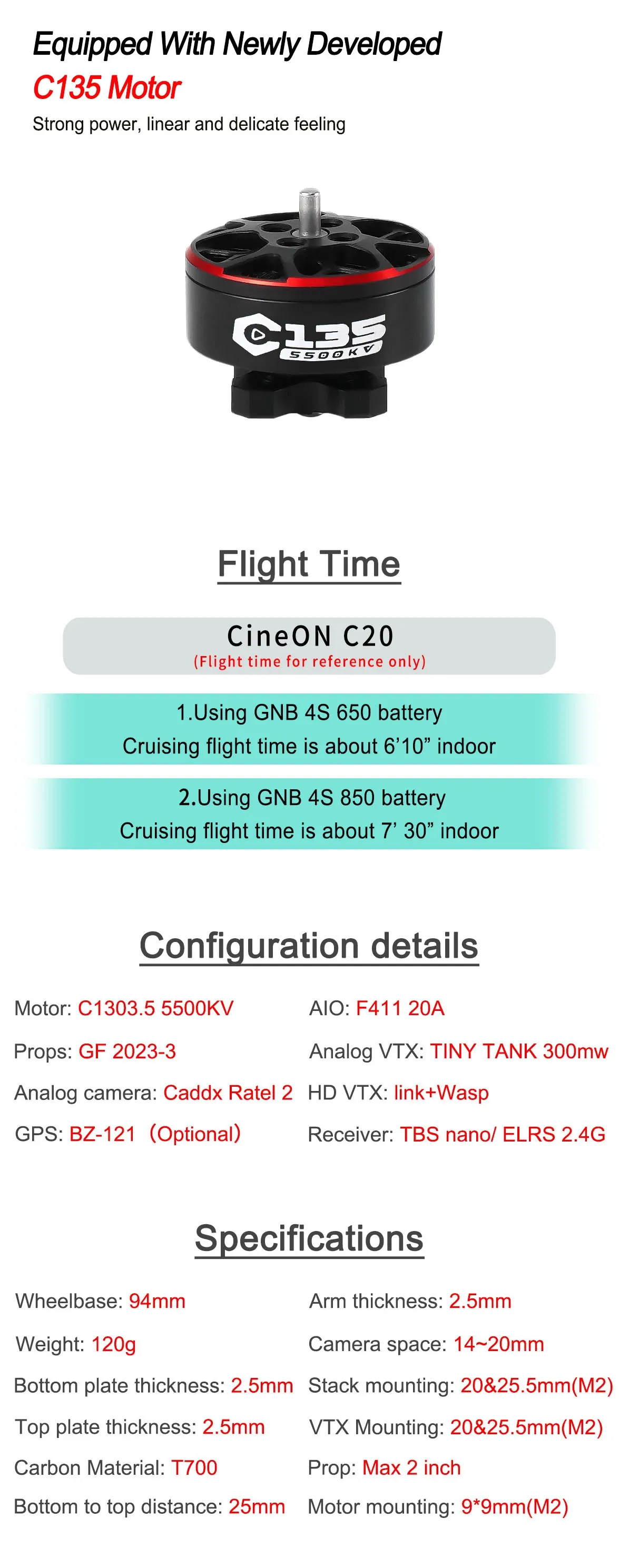 | Motors | AXISFLYING C135-5500KV @4S |