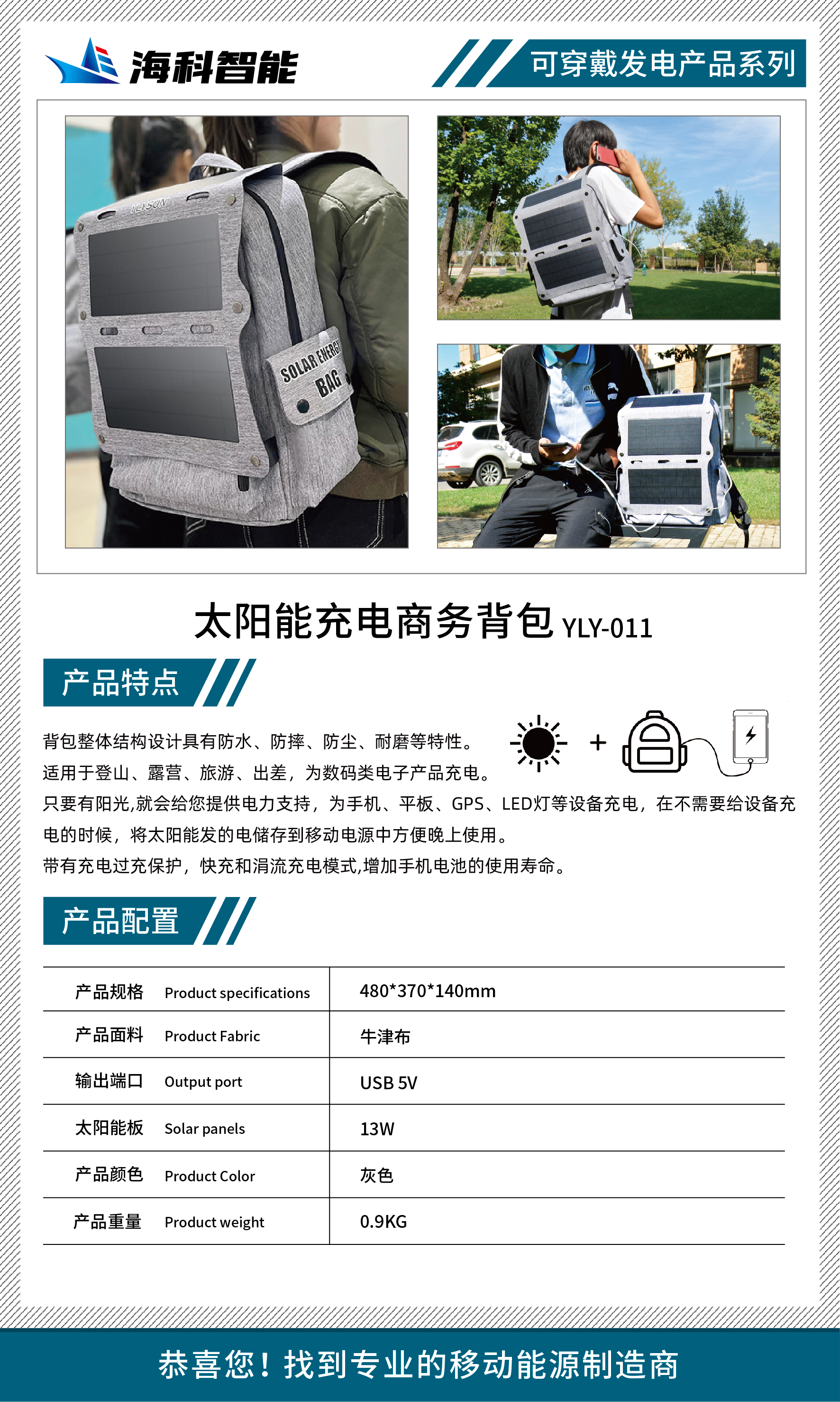 The overall structure design of the backpack features water resistance, shock resistance, dust resistance, and wear resistance. It is suitable for mountain climbing, camping, traveling, and business trips, and can charge digital electronic products. As long as there is sunlight, it will provide power support to charge devices such as mobile phones, tablets, GPS, and LED lights. When it is not necessary to charge the devices, the electricity generated by solar energy can be stored in the power bank for convenient use at night. It is equipped with overcharge protection for charging, fast charging and trickle charging modes to increase the service life of the mobile phone battery.