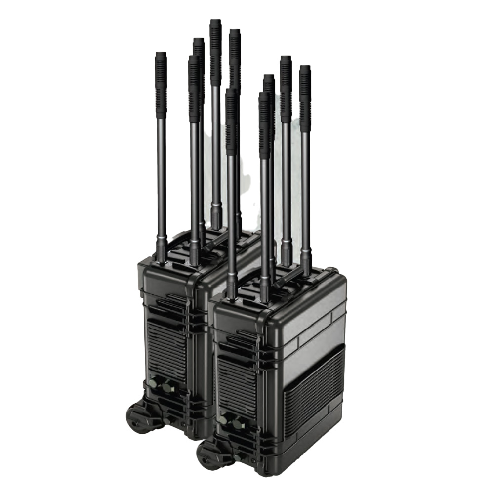 - High-power portable jammer with on-site programmable frequency and adjustable output power.